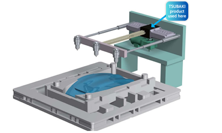 Zip Chain Actuator are used to move the nozzle opening that sprays processing oil onto the press die. They can be installed in a small space, and are compact and achieve high-speed traversal.