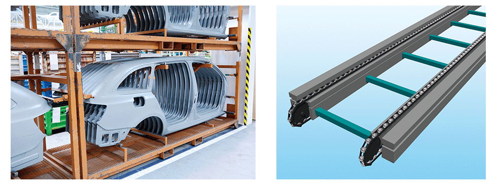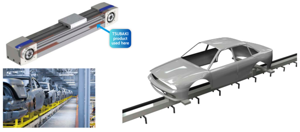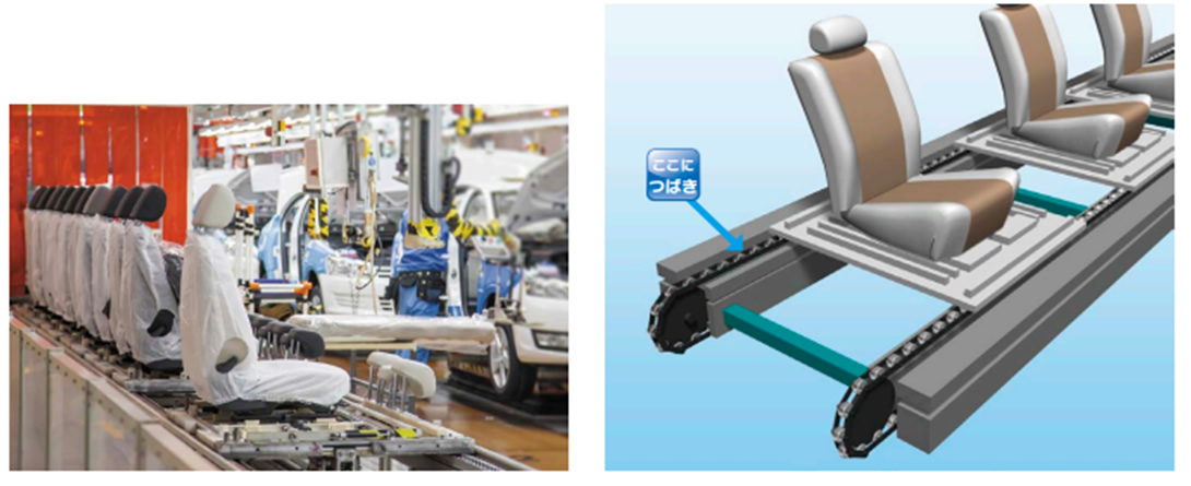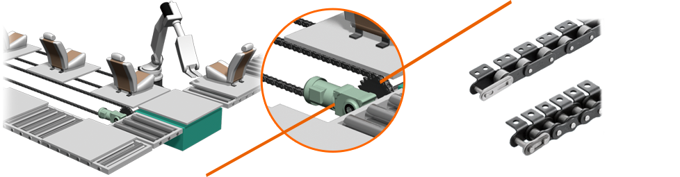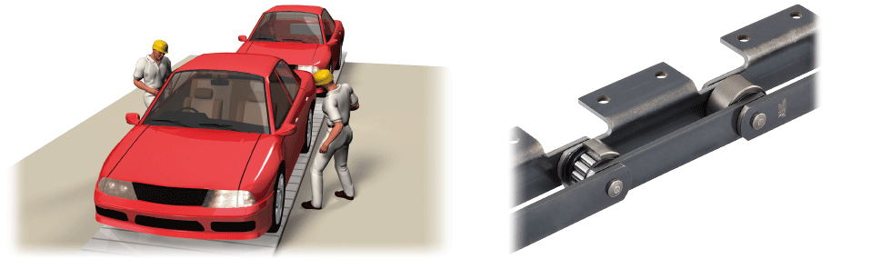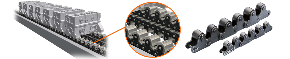 The ever-evolving RS roller chain and Super chain, which has Maximum allowable load and allows for a smaller chain size, are used in hanging drop lifters that raise and lower parts such as bodies and engines.