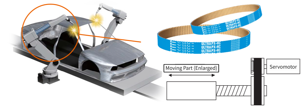 A clean transmission mechanism is required for the gun that moves the welding electrode, so Tsubaki Synchronous Belts Ultra PX Belt HC Type is used, which is a high-strength, compact transmission device that does not scatter grease or oil.