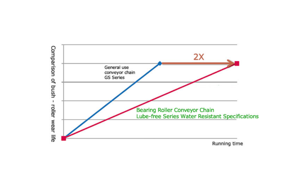Long, slow-conveyor length conveyors that are constantly exposed to water can experience stick-slip phenomenon, which is where our oil-Water Resistant Lube Free Series Bearing Roller Conveyor Chain comes into play.