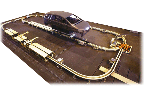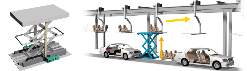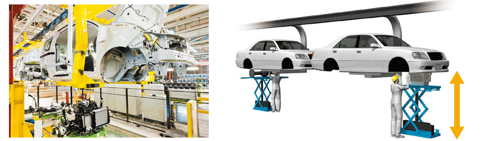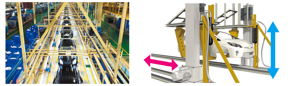 Lift Master are used in the lifting equipment for workpieces entering and leaving the lines where parts such as body frames and doors are welded and assembled. They can be used immediately by simply placing them on the line, and their low-floor, compact design allows for space savings.