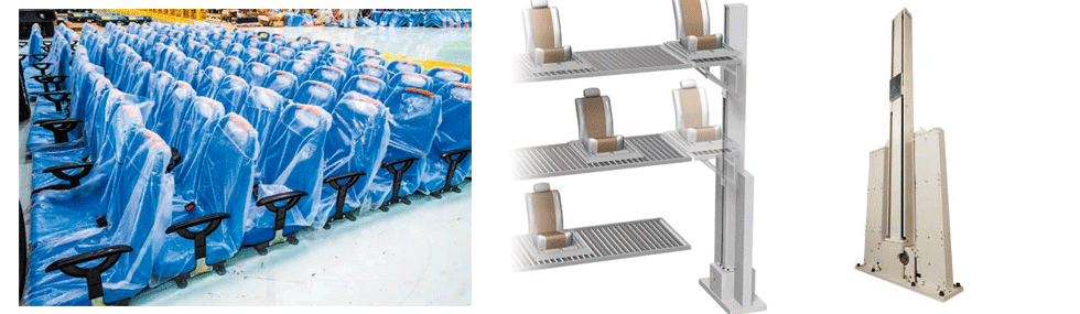 Interior parts such as seats are loaded onto pallets and transported to the assembly plant. Zip Master which can be raised and lowered at high speed, high frequency, and high precision, is used in multi-stage positioning equipment to distribute these parts to the roller conveyors that supply them to the assembly line. As it is a drop-and-pop type equipment, it can be installed in a short construction period, allowing for speedy on-site improvements.