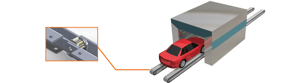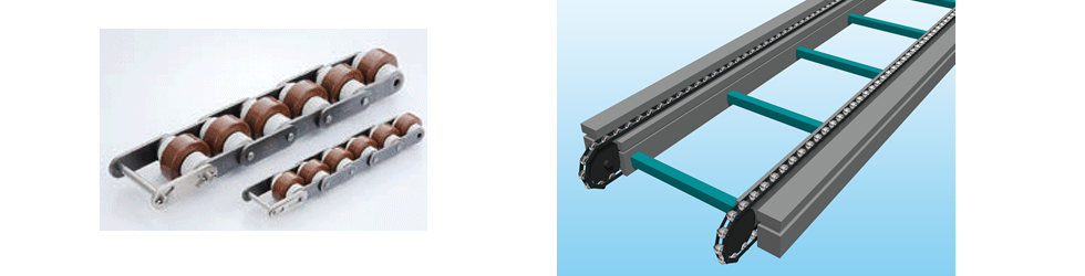 This chain's unique structure, which uses cylindrical bearing inside the rollers, not only suppresses stick-slip phenomenon, but also achieves high efficiency, reduced costs, and a long life for the rollers and rails.