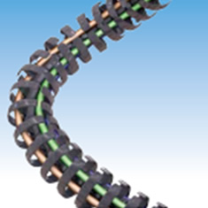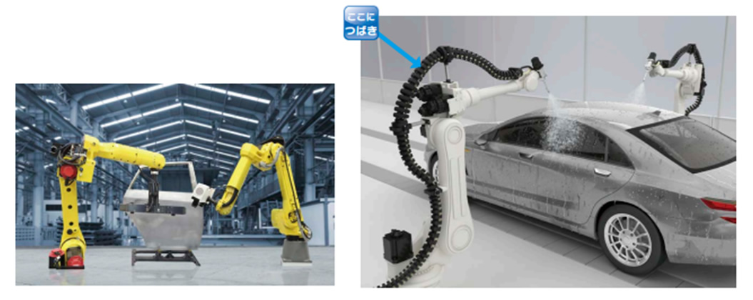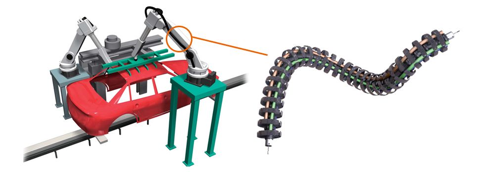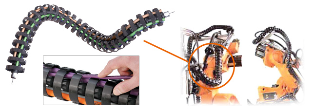 Robots are also being introduced into vehicle inspection processes, and the three-dimensionally moving Cable Carrier (CABLEVEYOR) ROBOTRAX is used on these robot arms. ROBOTRAX is Cable Carrier (CABLEVEYOR) with an open structure that allows cables to be inserted by pushing them into the slits on the side of the links, making maintenance work easy.