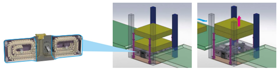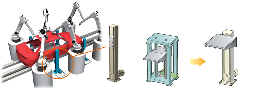 A module combining Lift Master and Pin gear drive unit is used in equipment that rotates heavy parts such as rear suspensions and transfers them between conveyors.By installing Lift Master, which can be placed and dropped, on a rotating plate that utilizes Pin gear drive unit, smooth rotation and transfer can be achieved in a small space.