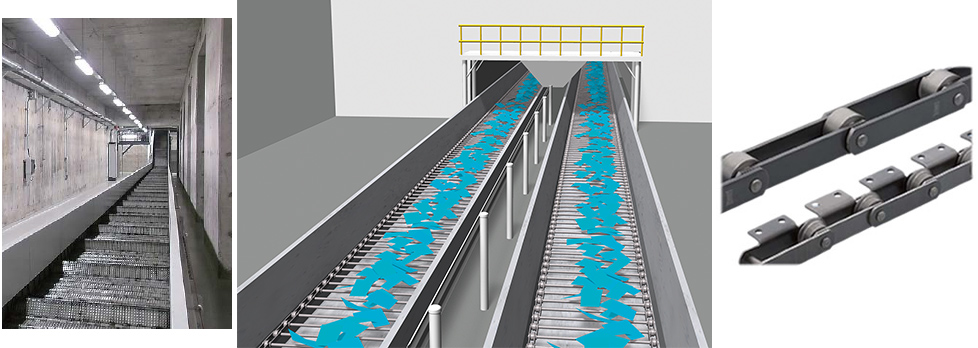 Multiple scrap conveyors operate under the floor of the press shop to remove excess materials from underneath the shop floor. The scrap conveyors are Tsubaki Large size conveyor chain with slats attached, and transport excess materials after pressing out of the shop.