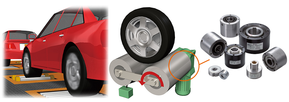 A reducer with a built-in one-way clutch is used to drive the rollers of an engine brake tester.