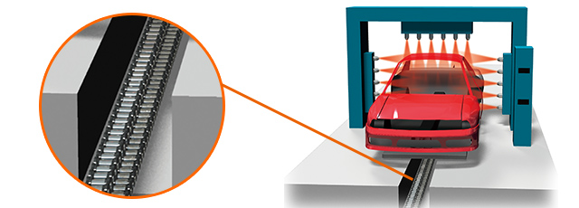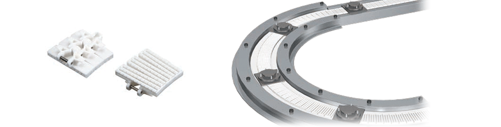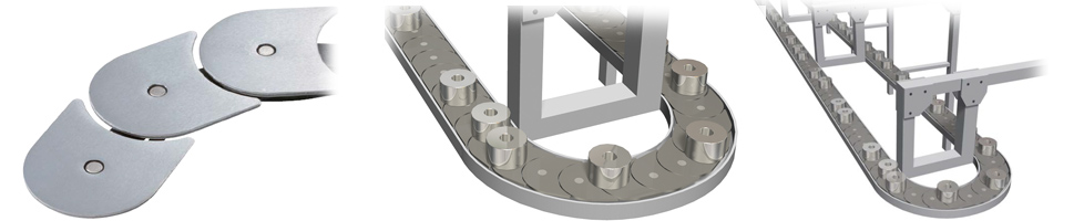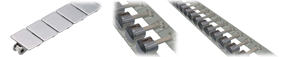 On parts processing and inspection lines, plastic chains and accumulation chains with rollers built into the conveying surface are used to prevent scratches on parts.