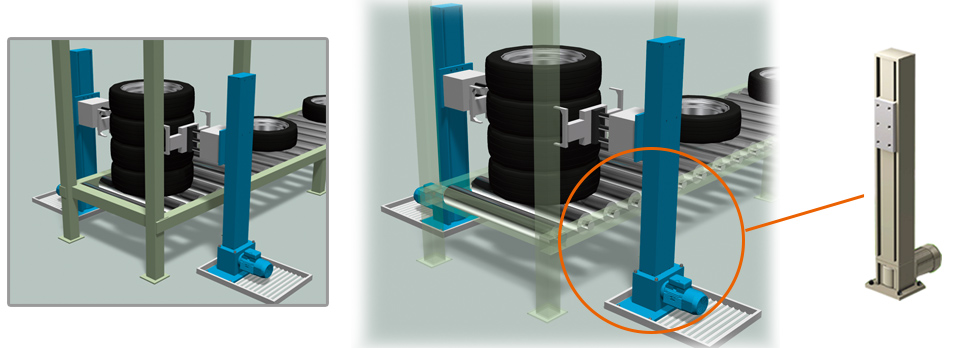 Before transporting tires stacked in groups of four to the assembly line, there is equipment that separates and de-stacks them one by one. This equipment uses Lift Master, which uses two lifting devices on both sides.