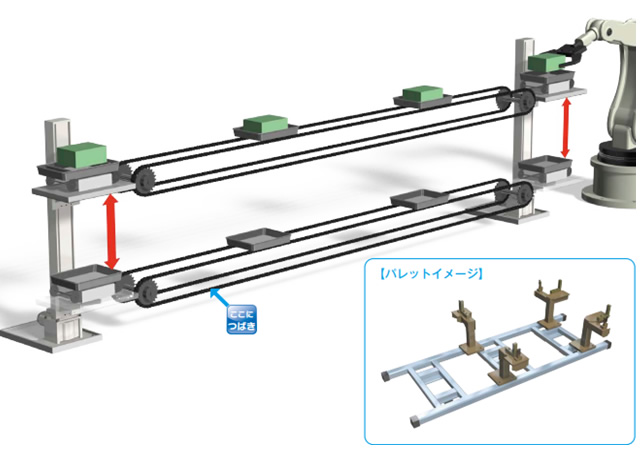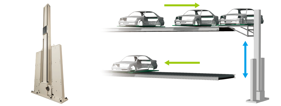 After picking up parts such as back doors loaded on pallets, Lift Master is used in equipment that raises and lowers the empty pallets to the recovery conveyor below.It can be raised and lowered on one side and can be installed in a small space, allowing for effective use of space.