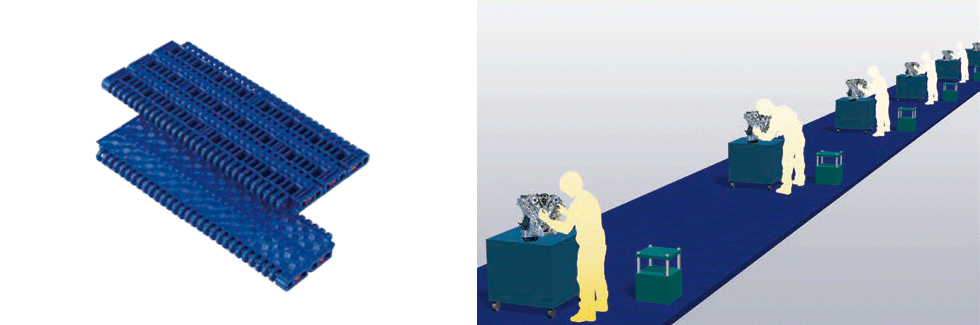 Conveyors using Plastic modular chain are used in the equipment that transports cart-loaded auto parts into and out of the factory at the receiving yard.The low-floor, drop-and-pump conveyor can be installed without digging a pit, allowing for equipment upgrades in a short period of time.
