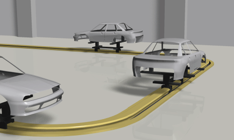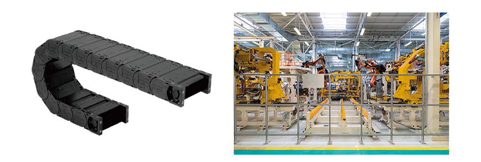 Cable Carrier (CABLEVEYOR) Plastic Series is used to protect the cables of welding robots that move across the area.
