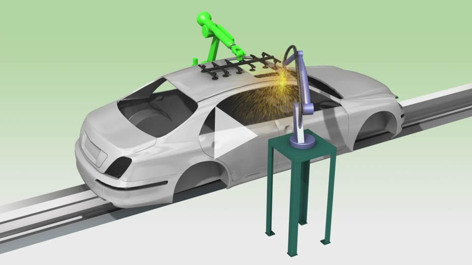 This is the process where parts made in the press process are assembled into the car body by many multi-axis robots. Most of the welding work is automated by machines.