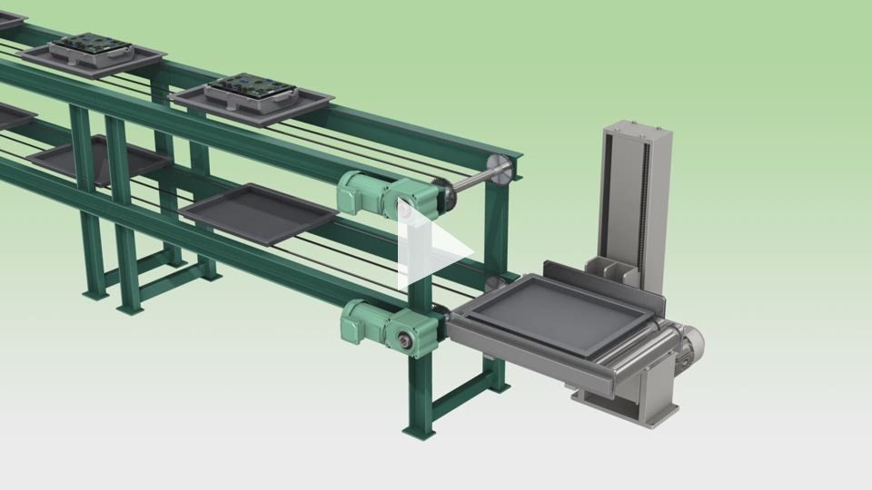 Parts are raised and lowered from the supply conveyor to the assembly workbench where workers assemble them. Tsubaki's Zip Chain Actuator is used, which can be installed in narrow spaces up to waist height of the worker.