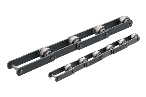 Top roller chains are free-flow chains that have the plate of Double pitch or RS-type roller chain extended upwards, with freely rotating top rollers attached to it. Specifications include hard chrome plated and buffed top rollers, allowing you to select the chain that best suits your work and environment.