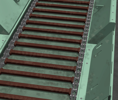 For this conveying mechanism, Tsubakimoto Chain provides proven feeder breaker (steel bushing) conveyor chains and flight bars.