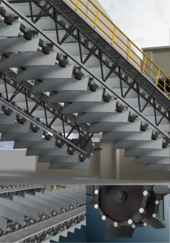 Reclaimer chains and chains with flights function like scraper conveyors without troughs, with the flights pushing the raw material out and feeding it to the subsequent belt conveyor.