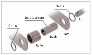 This design features solid lubricant pressed between the chain pins and bushings, and O-rings fitted between the links.