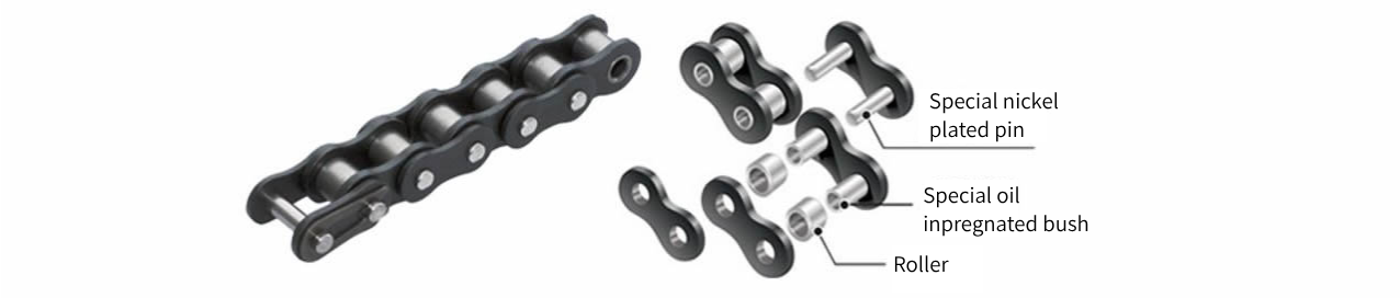 Tsubaki's Lambda Chain, a Lube-free chain, uses special oil-impregnated bush, ensuring a long lifespan without the need for additional lubrication.