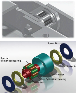Tsubaki achieves a longer chain lifespan by employing bearing rollers with excellent dust resistance.