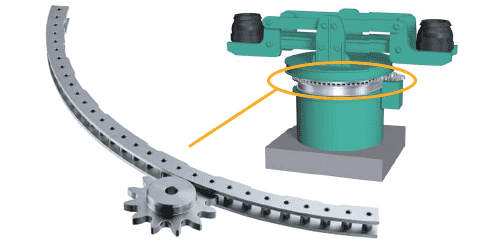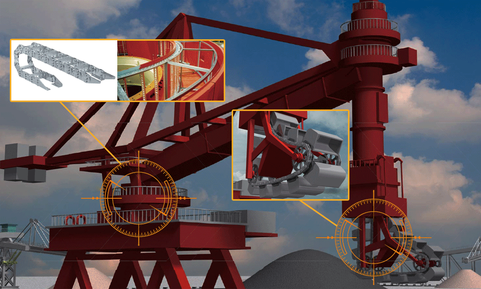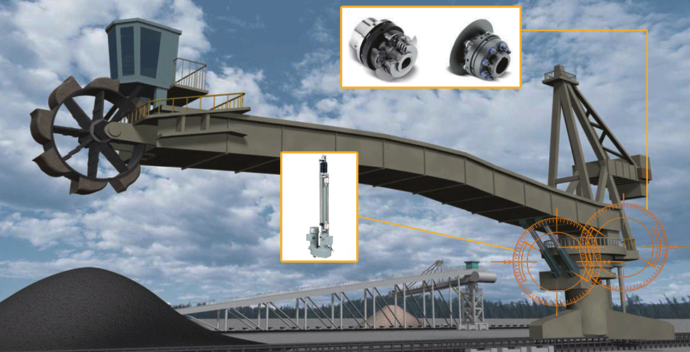 The reclaimer's swivel ring gear is driven by a pinion. Tsubaki's Mechanical protector instantly prevents overload caused by coal or debris clogging the gears, even in large equipment.