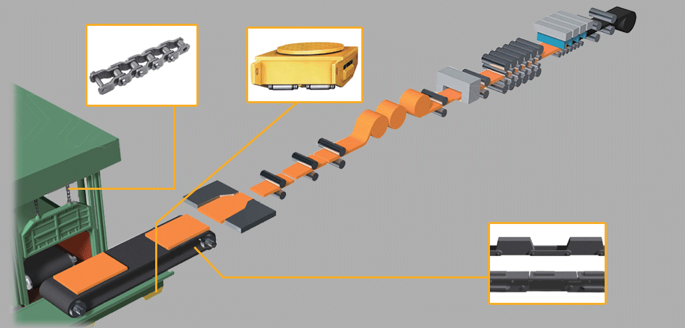 In steel sheet surface treatment lines, including CAL and CGL, continuous surface treatment is performed. This involves welding the joints between coils at the input end and cutting the coils after winding at the output end. When the flow becomes discontinuous, the carriage of the loop tower is raised and lowered to smoothly deliver the stored steel sheets. The reliable and proven Heavy duty drive chain plays a vital role in raising and lowering the carriage.