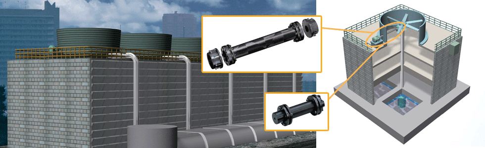 For cooling towers with large fan diameters, a long spacer type of ECHT-FLEX coupling is ideal between the motor driving the fan and the gearbox.