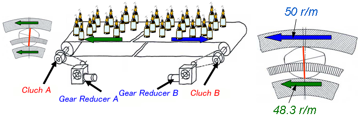 In the diagram above, the conveyor is moving in the direction of the green arrow, and the reducer operates the conveyor at 50 rpm via Cam Clutch A. Cam Clutch A carries the load, causing slippage and resulting in 48.3 rpm. Reducer B does not receive the load, so it rotates at 50 rpm, but Cam Clutch B prevents the 50 rpm from being transmitted to the conveyor.