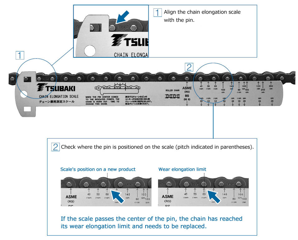 - You can check the amount of wear on RS roller chains, BS roller chains, and Leaf chains, and be notified when it's time to replace them.