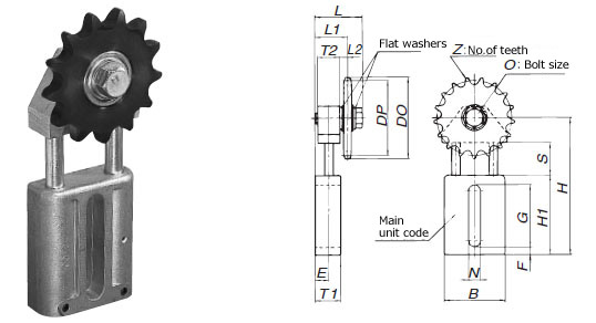 The idler sprocket section consists of a sprocket with a built-in bearing (an oil-less bush type is also available as an option for the TH type), mounting bolts and washers.