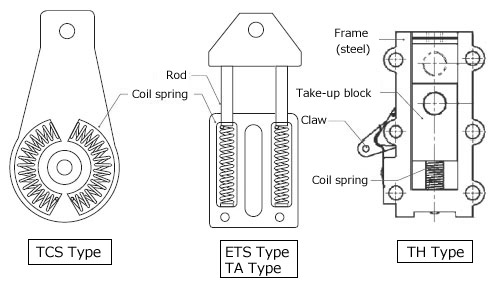 • The main body of the chain tensioner contains two coil springs. The elasticity of these coil springs is used to press the idler sprocket or plastic shoe attached to the tip of the chain, adjusting the slack.