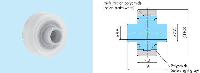 The inner circumference uses an engineering plastic material that has low resistance to the shaft, and the outer circumference uses a soft material that has high resistance to the chain, resulting in excellent rotational performance. This is effective when you want to avoid scratching the top surface of the chain slats, and also when you want to reduce noise on the return trip. We have also added a new type to our lineup that minimizes the generation of Wear debris by reducing contact with the top surface of the slats and using bearings in the shaft hole.