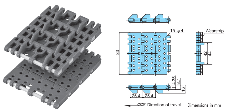 Chain pitch mm Open area rate % Backbend radius mm