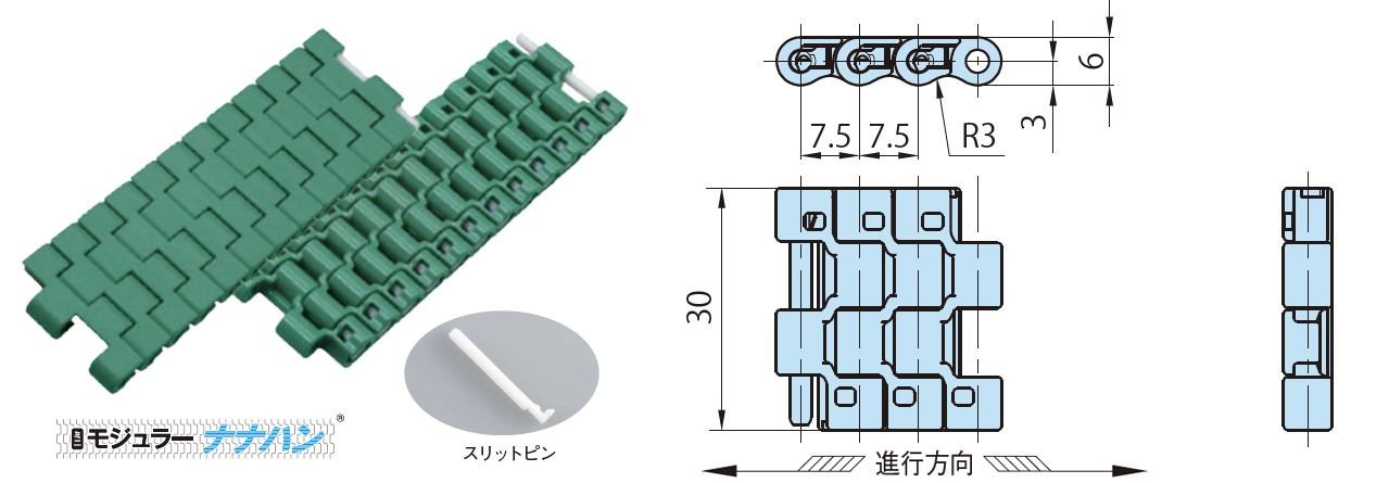 • ・プラスチックモジュラーチェーン初のチェーン幅30mmを採用