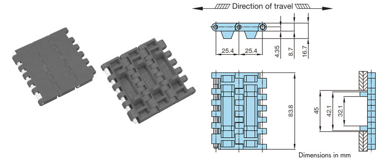 • - Chain pitch = 25.4 mm, ideal for transporting beverage containers.