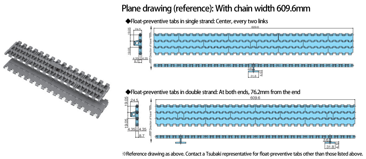 • - This type of BTC6RN has float-preventive tabs to prevent the chain from lifting off the frame.