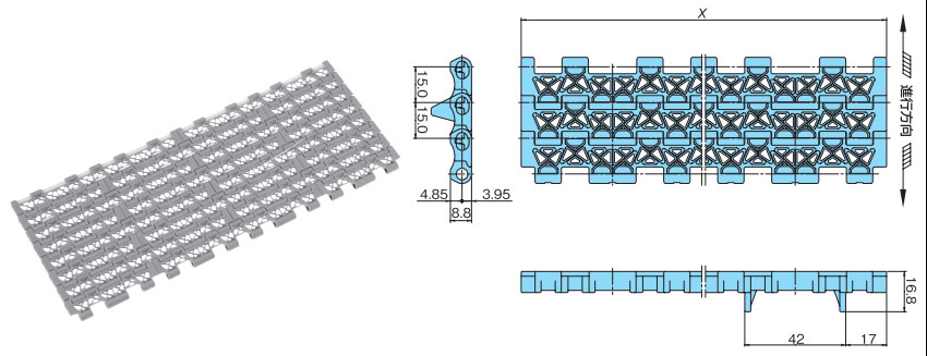 • ・幅広と幅狭のプラスチック製モジュールをレンガ状に組合せ、ワイドな搬送面を実現し大量搬送が可能です。