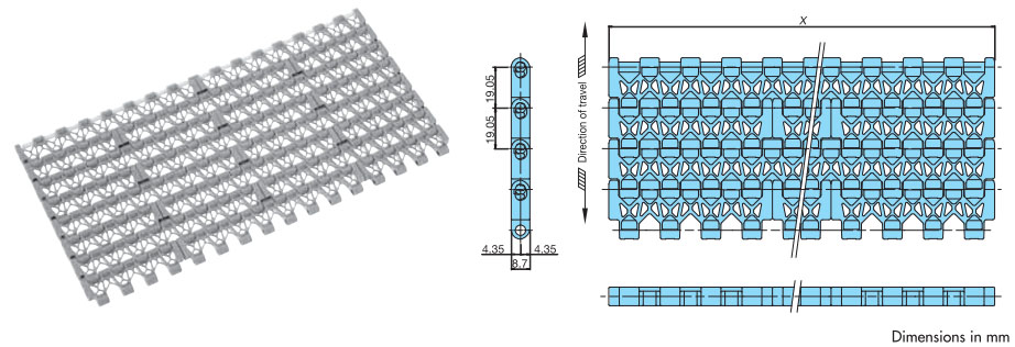 • ・幅広と幅狭のプラスチック製モジュールをレンガ状に組合せ、ワイドな搬送面を実現し大量搬送が可能です。
