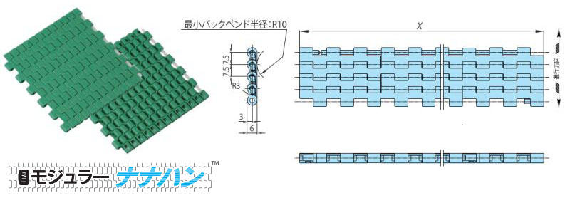 プラスチックモジュラーチェーンWT0705-W形 主要諸元