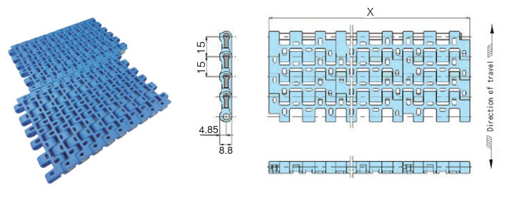 Chain pitch mm Open area rate % Backbend radius mm