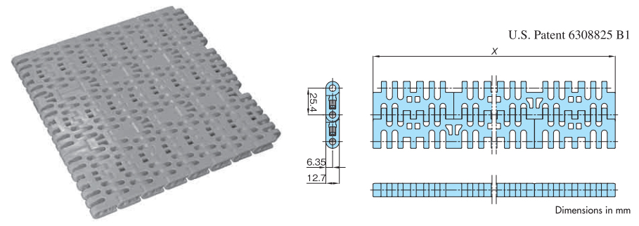 • - Wide and narrow plastic modules are combined like bricks to create a wide transport surface, enabling large-volume transport.