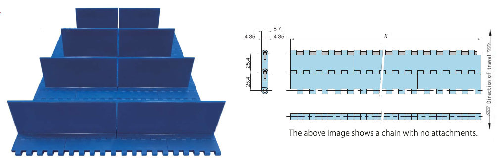 • ・幅85mmと170mmのモジュールリンクの組合せで構成したプラスチックモジュラーチェーンです。