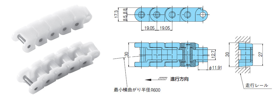 • ・RSP60 curved type. Plastic block chain can also be used on curved conveyors.