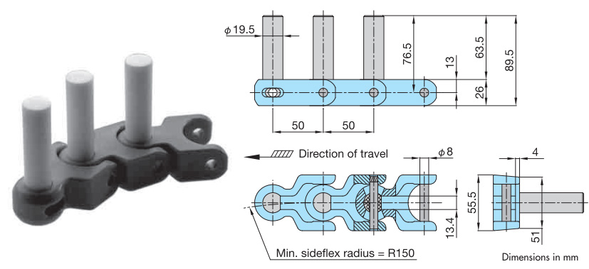 • ・小さな横曲がり半径(R=150)。自由なレイアウトが可能で、狭いスペースでの搬送に最適です。