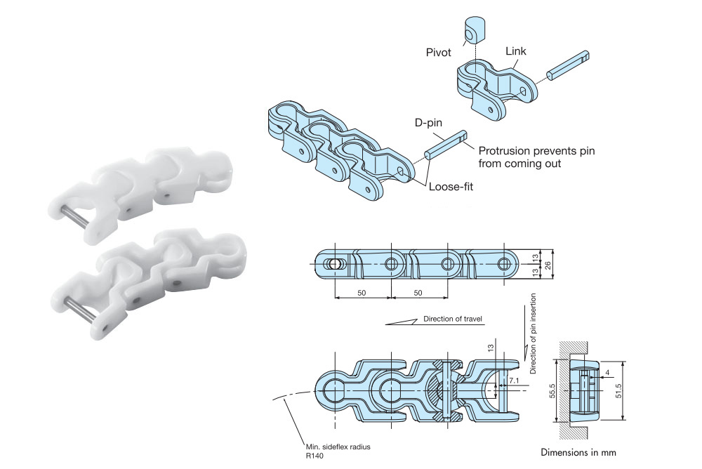 • ・横曲がり時のリンクーリンクの隙間を小さくする、プレート構造。搬送物の安定搬送に適します。