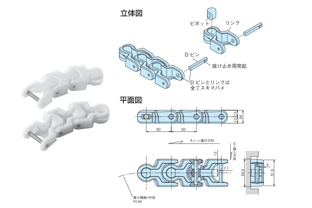 • ・小さな横曲がり半径(R=140)。自由なレイアウトが可能で、狭いスペースでの搬送に最適です。