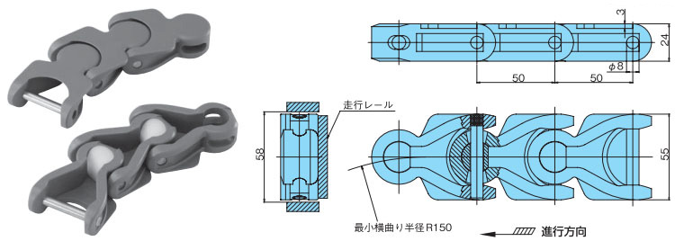 • ・横曲り半径(R=150)が小さくコンパクトなレイアウトが可能です。