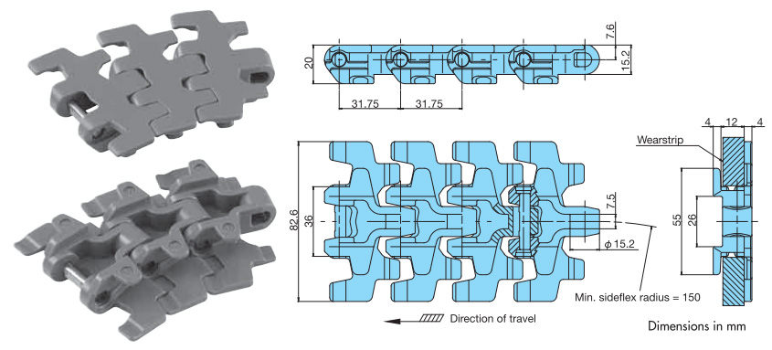 • - Chain with lift-up prevention attachment. Prevents lift-up at corners and on ascending and descending conveyors, as well as damage to the upper surface of the plate on the return side.