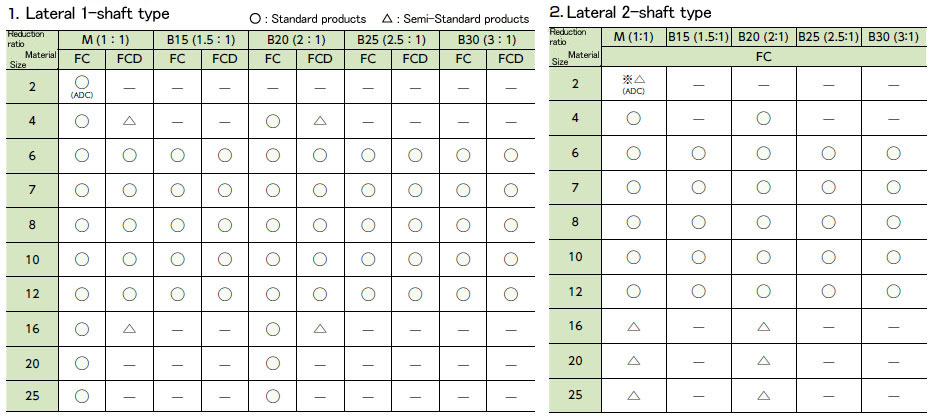 Note 2) The size 2 lateral 2-shaft type can be manufactured with shaft arrangements 1-1-UD(-O), 1-1-U(-O), 1-1-D(-O), U-D-LR(-O), U-D-R(-O), and U-D-L(-O).