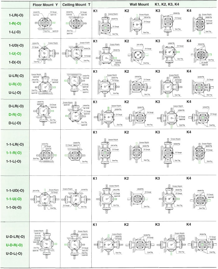 ・Floor mounting (Y) is standard for sizes 6 to 25. When ceiling mounting (T) or wall mounting (K1 to K4) is used, the positions of the oil gauge, plug, and grease nipple will differ.
